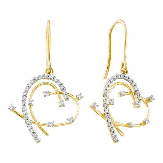 10kt Yellow Gold Womens Round Diamond Heart Dangle Wire Earrings 3/8 Cttw