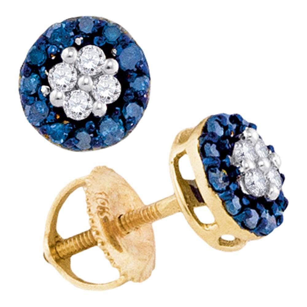 10k Yellow Gold Blue Color Enhanced Round Cluster Diamond Womens Screwback Stud Earrings 1/3 Cttw. | Combined diamond weight of 1/3 carats total weight represents a range of 0.30 - 0.36 cts. t.w. | All colored diamonds in this piece are treated to permanently alter their appearance. | Stone 2: Diamond; 1/8 ct.t.w.; J-K color; I2-I3 clarity; Cluster setting; Treatment - Not-treated
