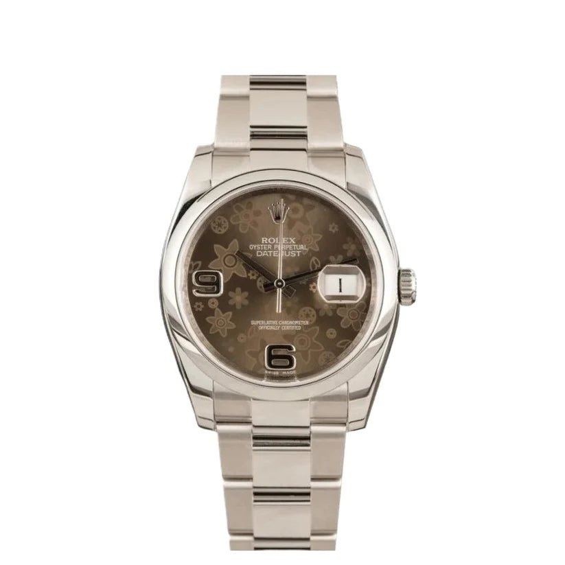 As a reputable brand in the luxury watch industry, Rolex presents the Datejust 36mm Brown Floral Dial Oyster Stainless Steel Watch 116200. This timepiece boasts a stunning 36mm floral dial and a durable Oyster stainless steel band. Elevate your style with this elegant and reliable watch.